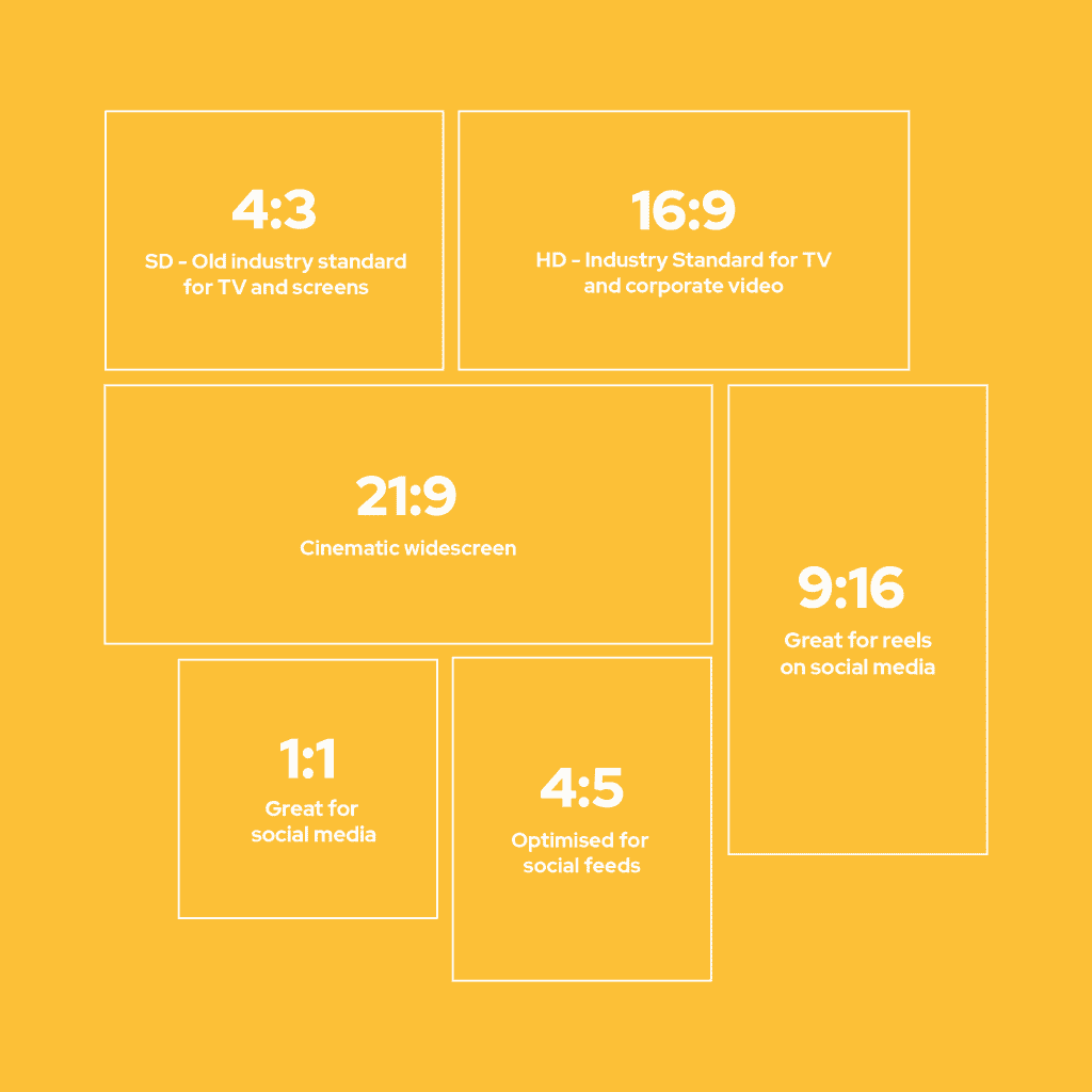 In simple terms, an aspect ratio is the shape of your video. It’s expressed as width:height (e.g. 16:9), and different platforms and devices favour different formats.